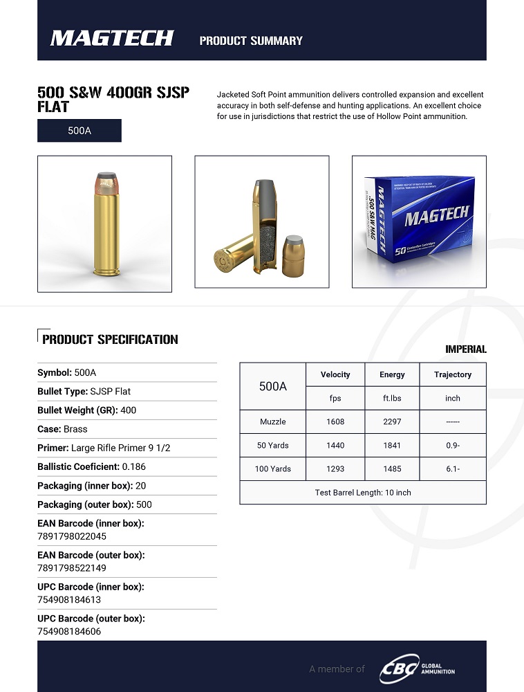 BOITE DE 20 CARTOUCHES MAGTECH 500 SW 400GR SJSP FLAT 500A