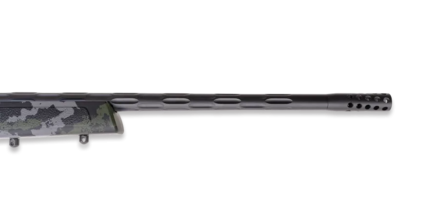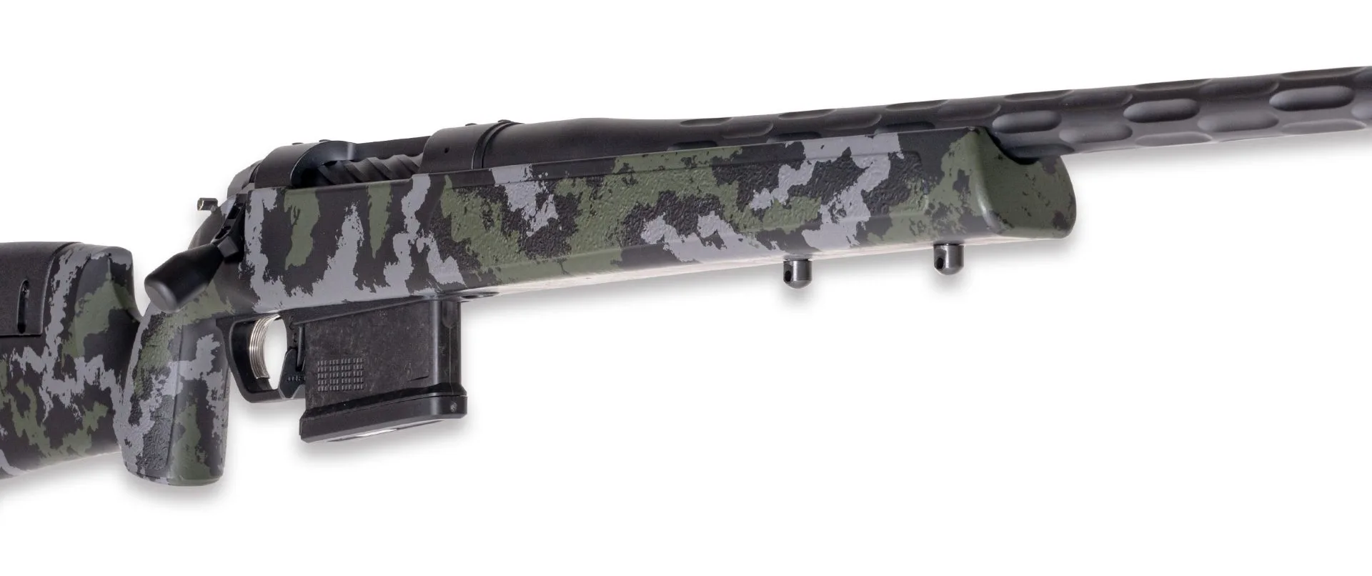 Canon cannelé – Pontet/boîtier de culasse en Cerakote noir graphite – Culasse/poignée de culasse en Cerakote noir graphite – Crosse peinte à la main avec motif éponge vert/gris et appui-joue noir graphite