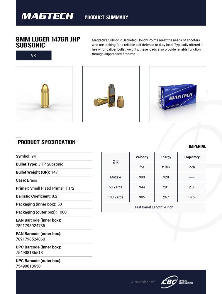 Cartouches Magtech 9×19 FMJ 115 gr / 7,45 g x 50