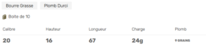 CHEVROTINE 9 GRAINS CAL 20/16/67 – Bourre Grasse – 24g – Plomb Durci /boite de 10