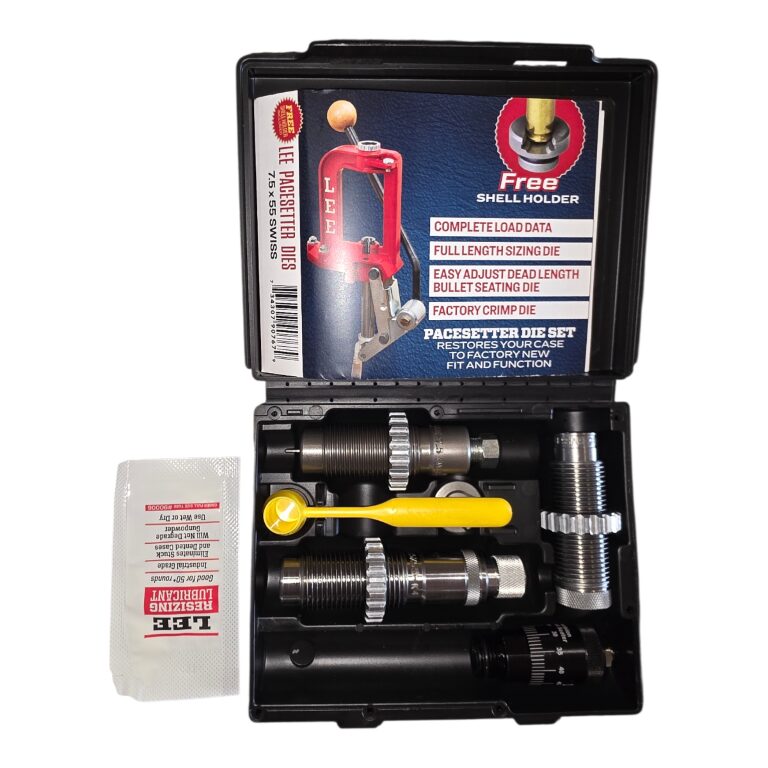 Les matrices Lee PaceSetter Dies incluent la matrice de sertissage exclusive Lee Factory pour produire des munitions d’usine avec une utilité et une précision améliorées. Le jeu de matrices comprend également un siège pour balle facile à régler. Ils comprennent également un support de d’étui (shell holder), une dosette à poudre, des données de charge et sont emballés dans la plus belle boîte de rangement jamais conçue.