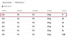 | Plomb | 1, 2, 4, 6, 7,5 |