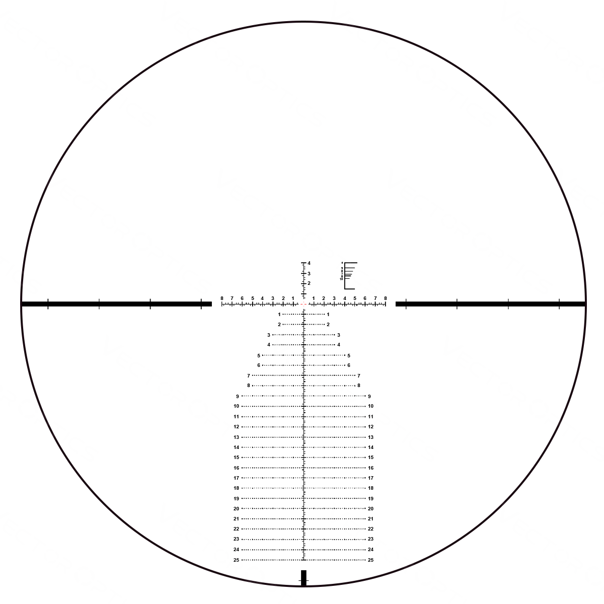 – Réticule de visée MIL tactique VCT-34FFP en verre gravé, point central éclairé avec lignes et points numériques.